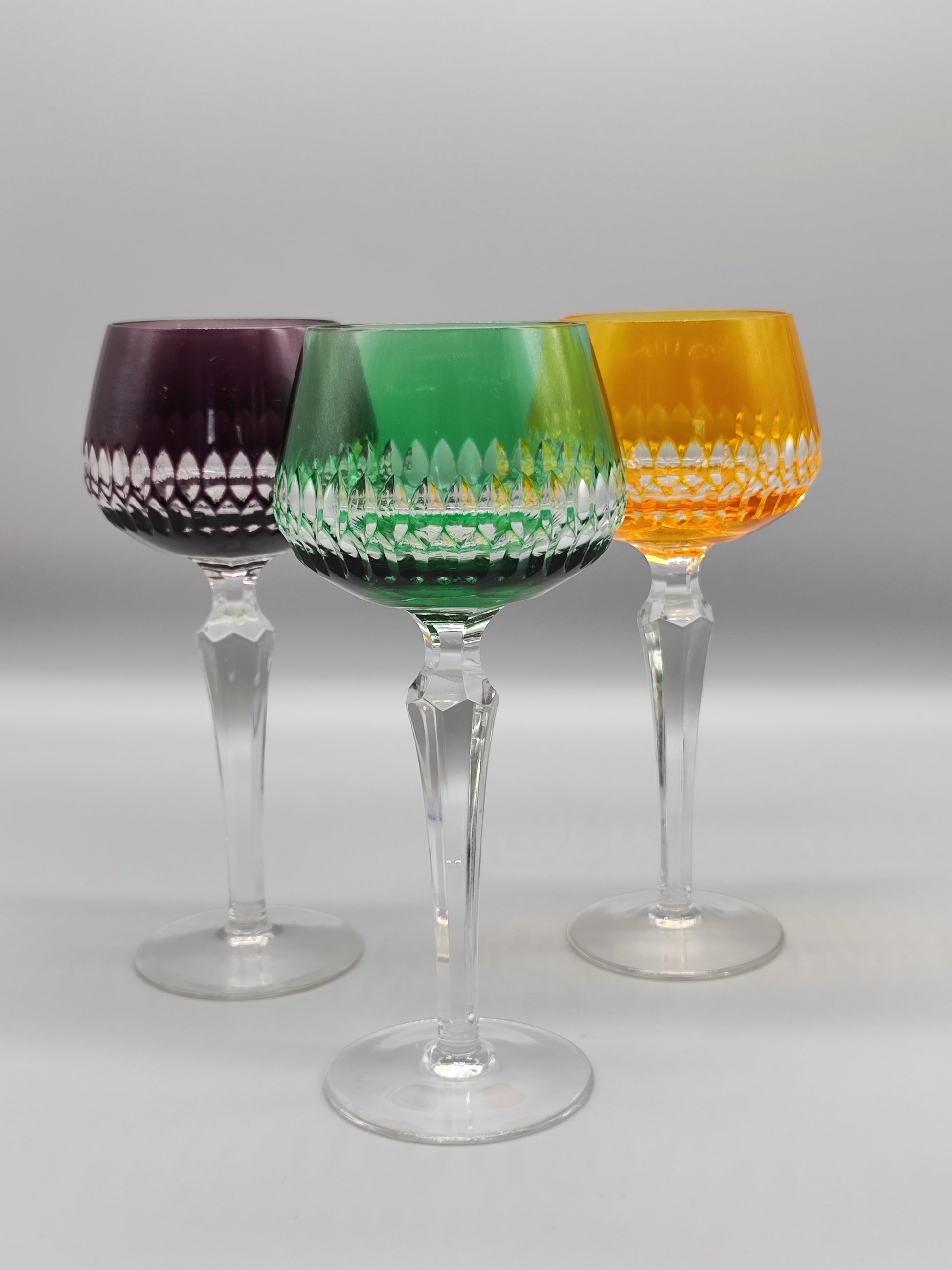 Drei Weingläser aus Kristall mit Wappen und Blumenmuster Dreiecke