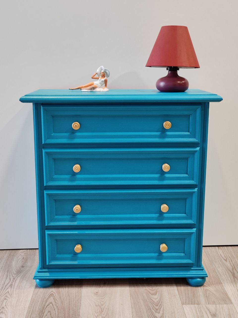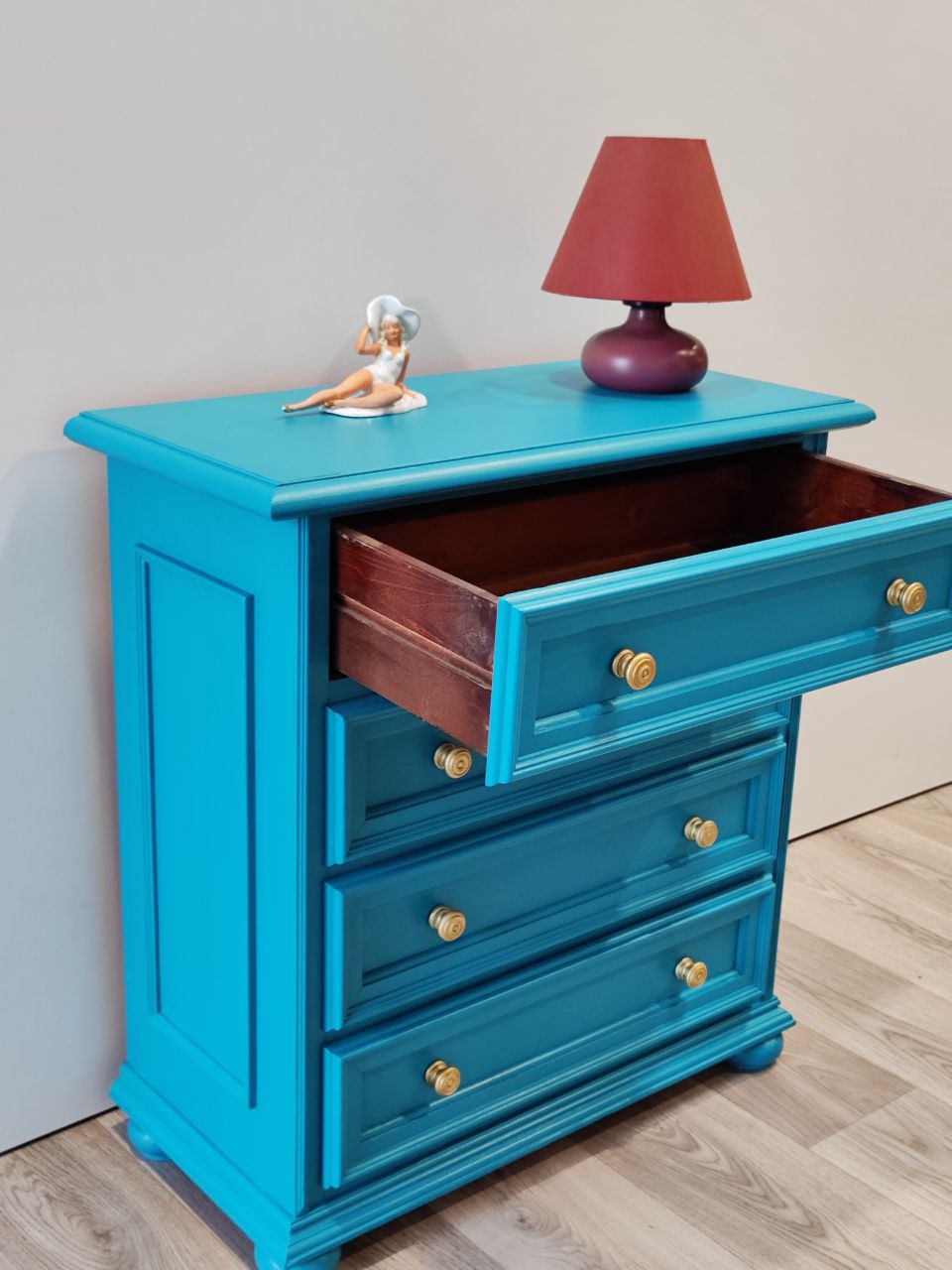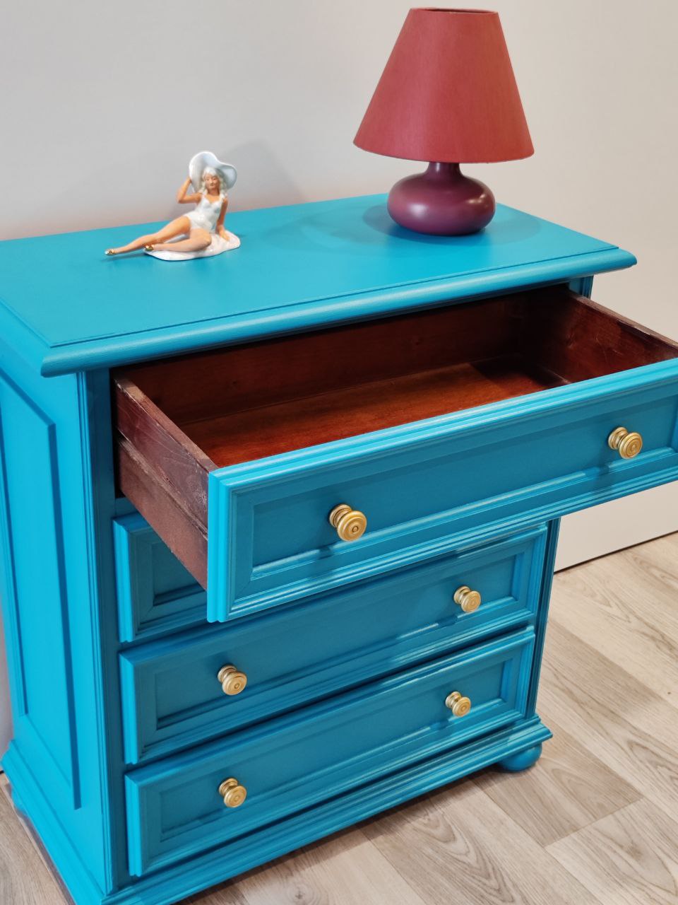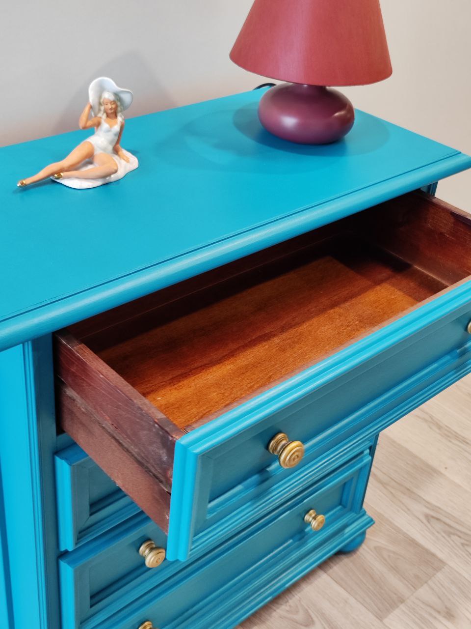 Die Kommode ist aus wertvollem Holz gefertigt, sorgfältig restauriert und mit einem Schutzüberzug versehen. Die Handwerker haben den Vintage-Stil bewahrt und die Kommode mit einer Farbe in leuchtendem, zeitgemäßem Farbton überzogen - sie haben sie wieder modern gemacht.