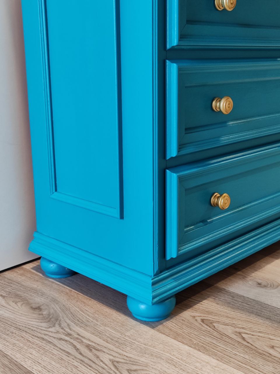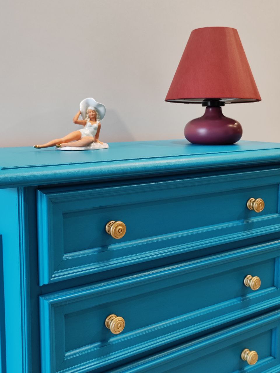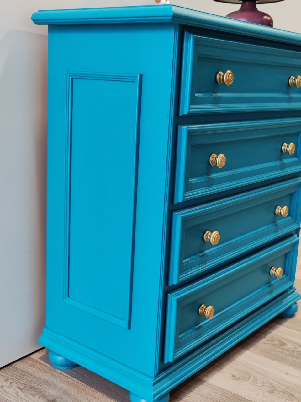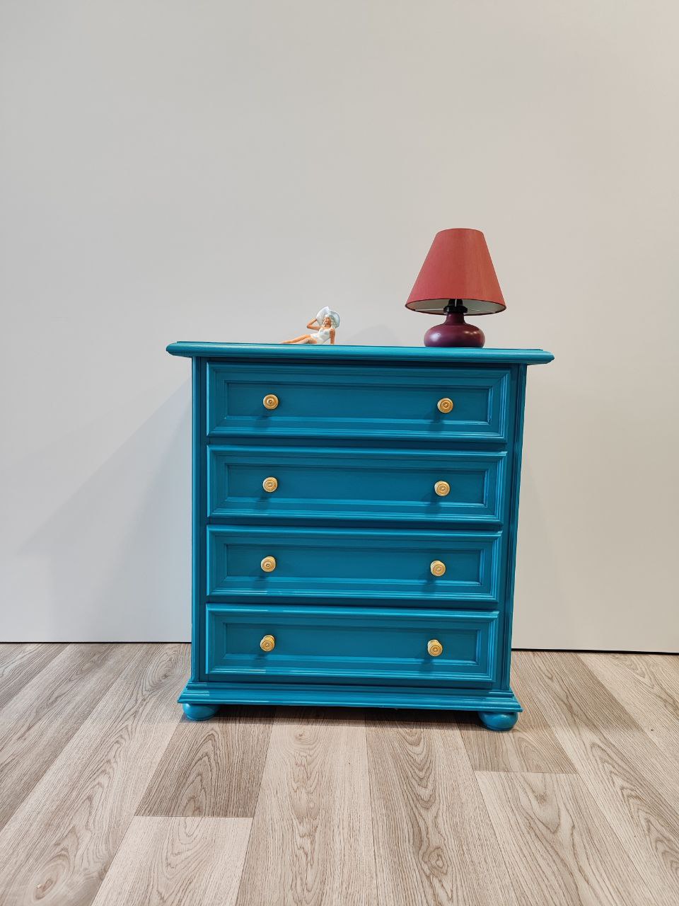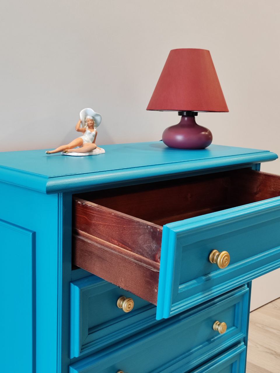 Die Kommode ist aus wertvollem Holz gefertigt, sorgfältig restauriert und mit einem Schutzüberzug versehen. Die Handwerker haben den Vintage-Stil bewahrt und die Kommode mit einer Farbe in leuchtendem, zeitgemäßem Farbton überzogen - sie haben sie wieder modern gemacht.
