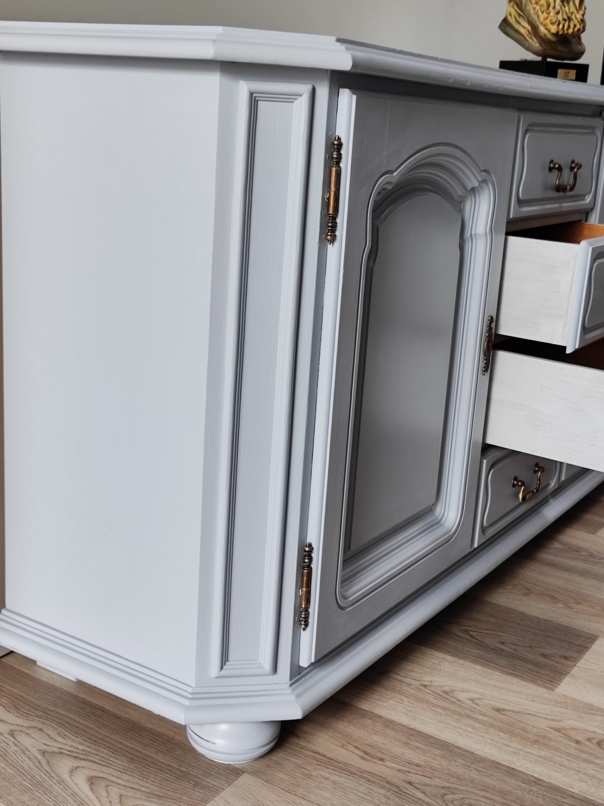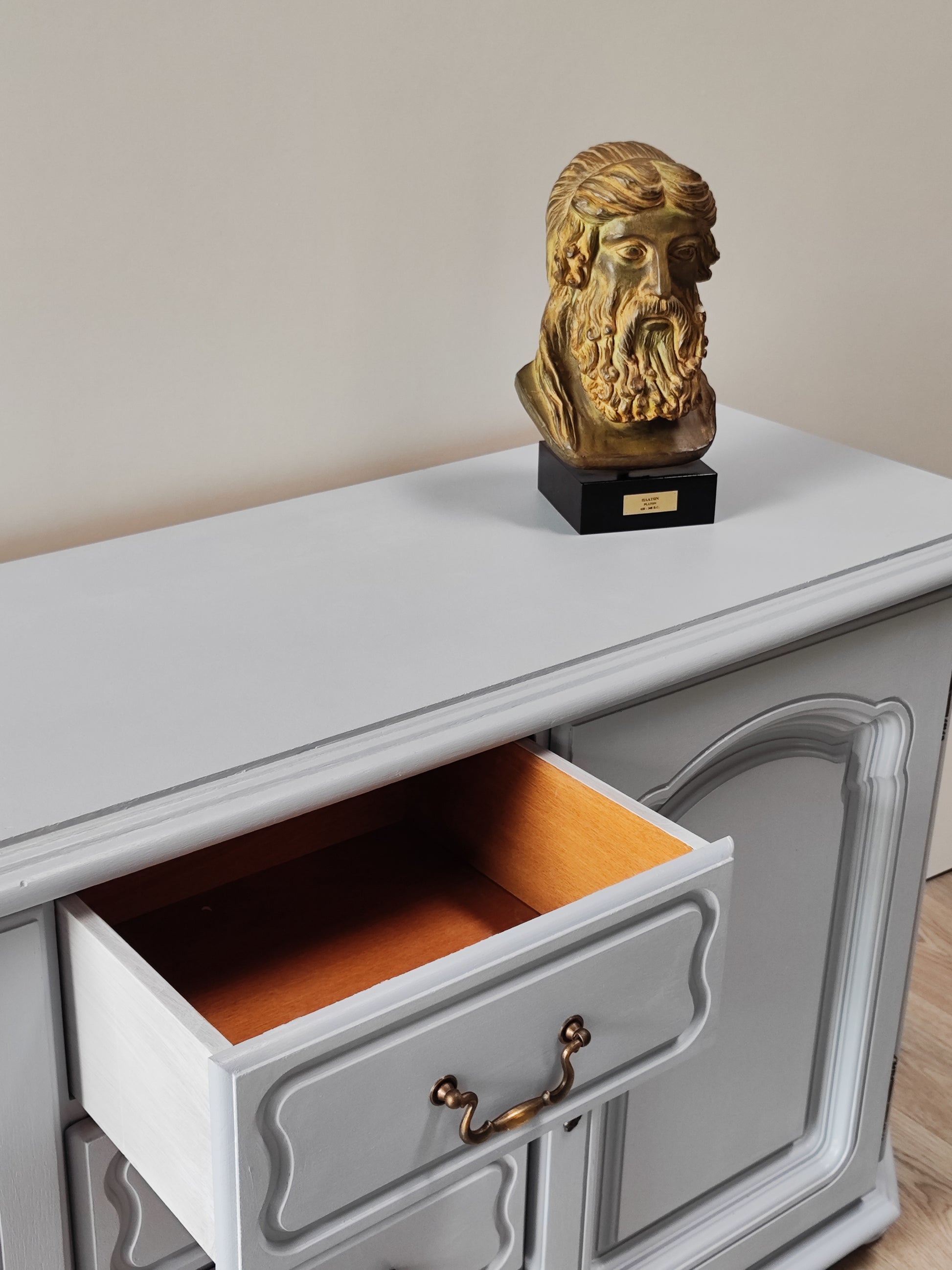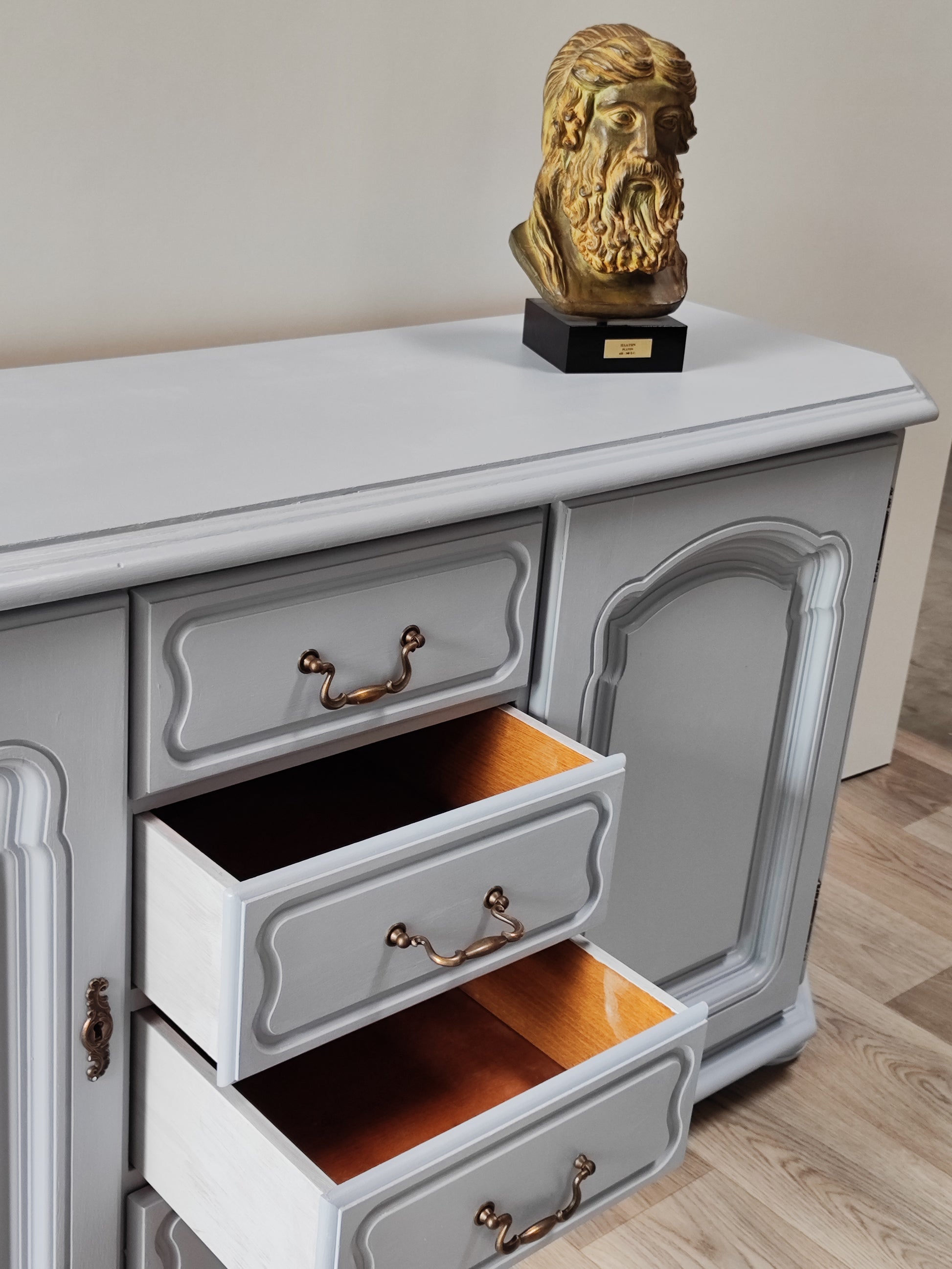 Die Kommode ist aus wertvollem Holz gefertigt, sorgfältig restauriert und mit einem Schutzüberzug versehen. Die Handwerker haben den Vintage-Stil bewahrt und die Kommode mit einer Farbe in leuchtendem, zeitgemäßem Farbton überzogen - sie haben sie wieder modern gemacht.