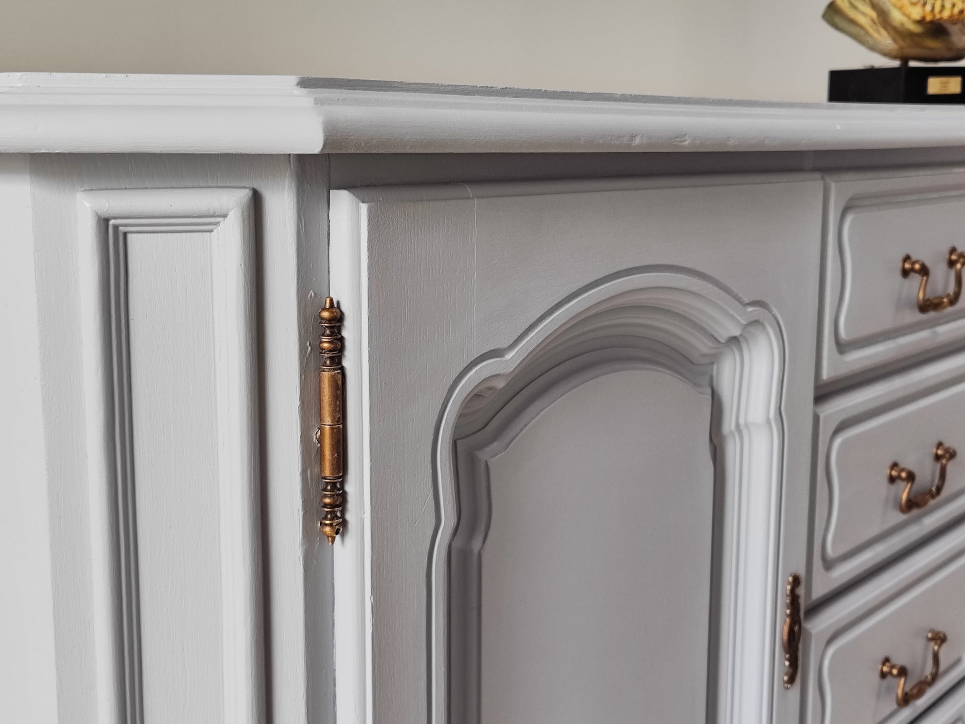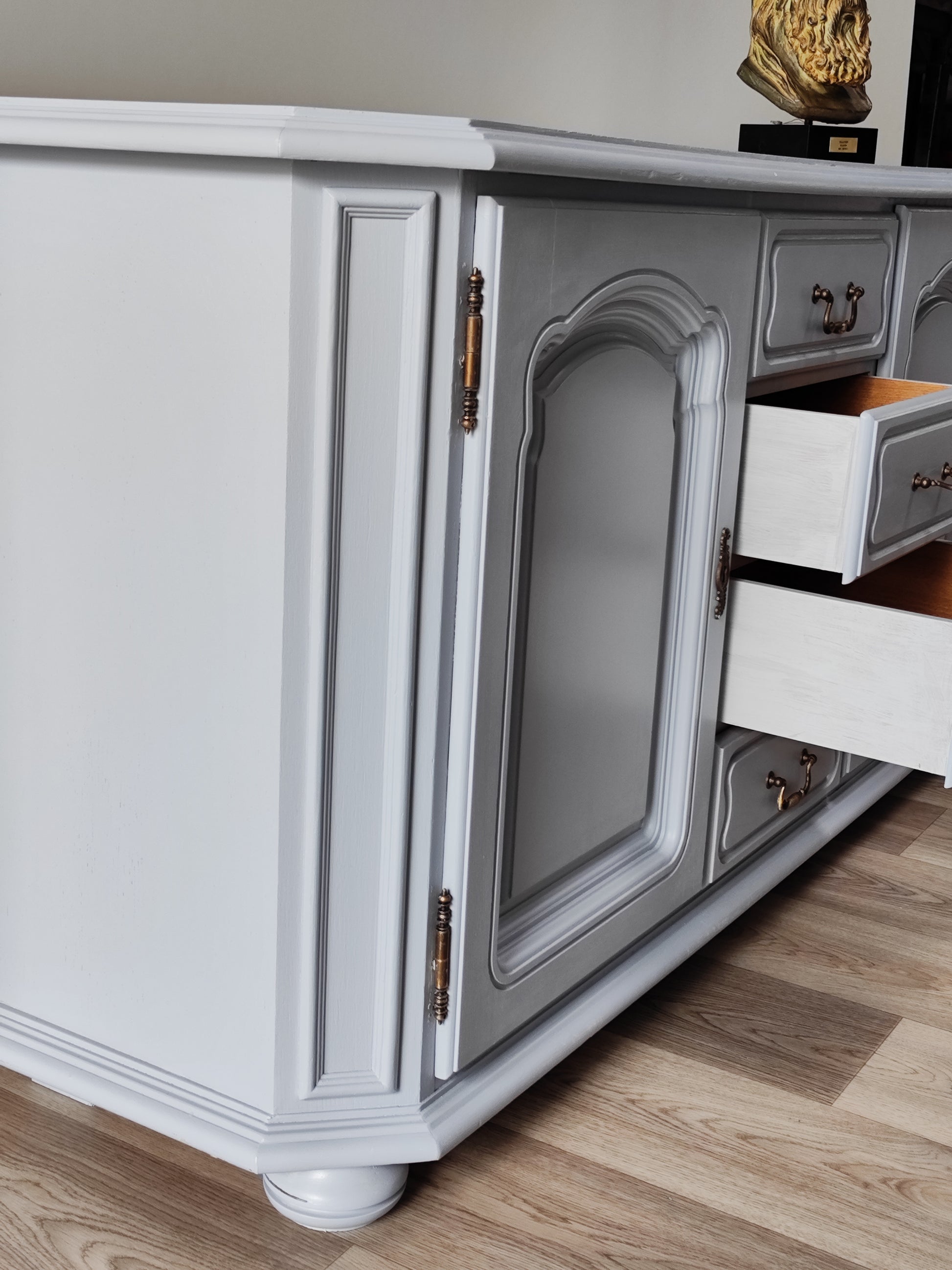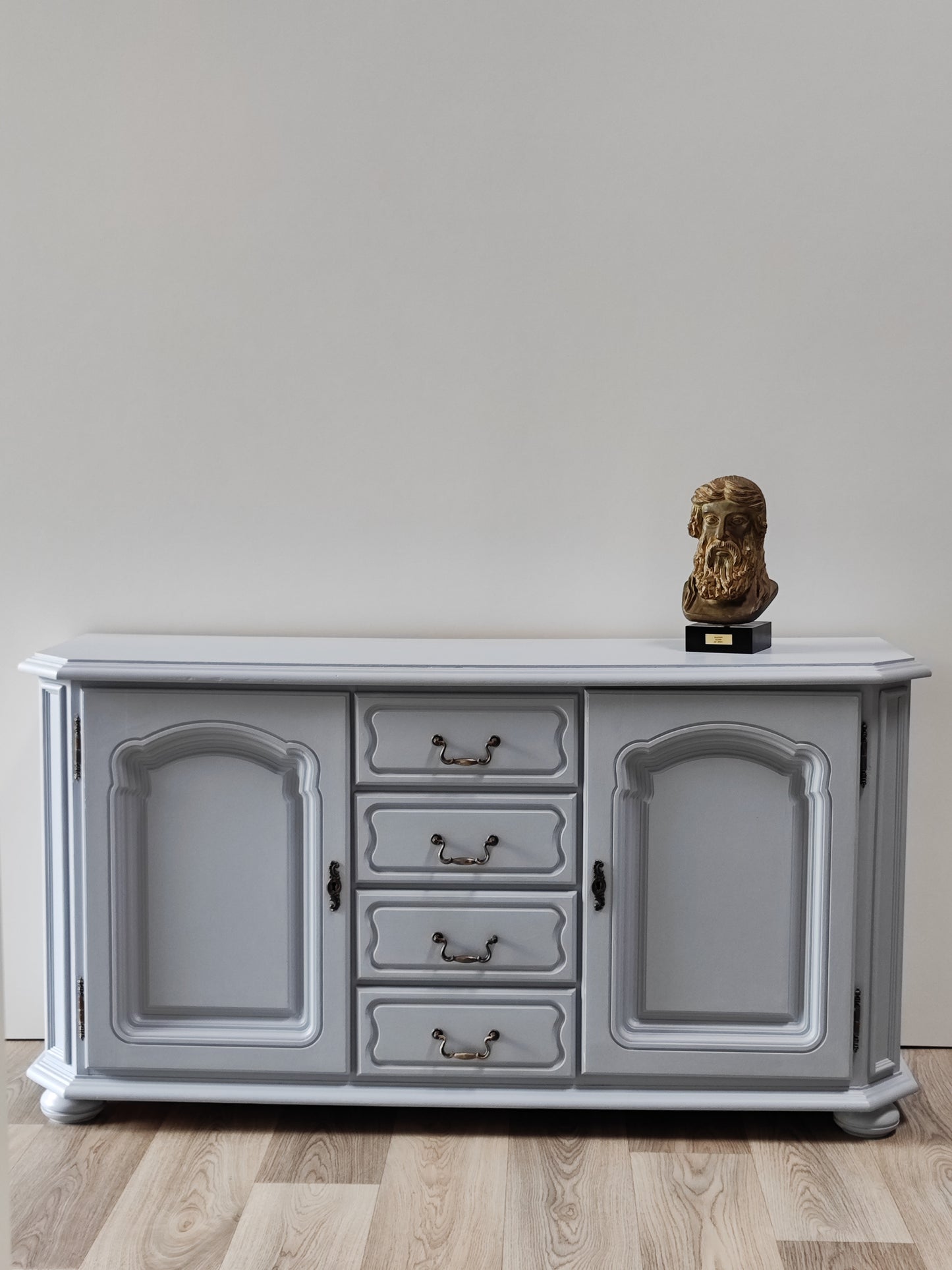 Die Kommode ist aus wertvollem Holz gefertigt, sorgfältig restauriert und mit einem Schutzüberzug versehen. Die Handwerker haben den Vintage-Stil bewahrt und die Kommode mit einer Farbe in leuchtendem, zeitgemäßem Farbton überzogen - sie haben sie wieder modern gemacht.