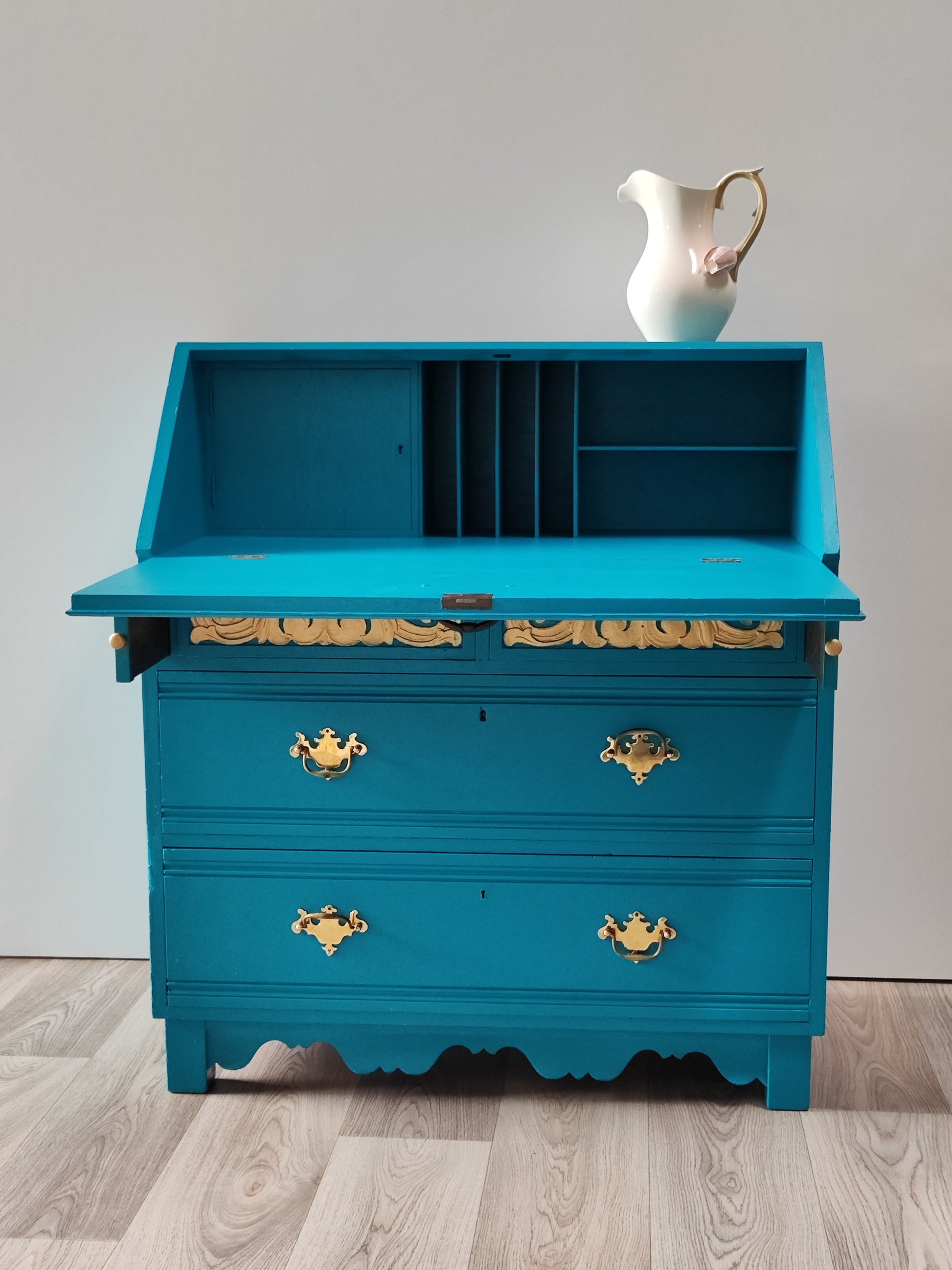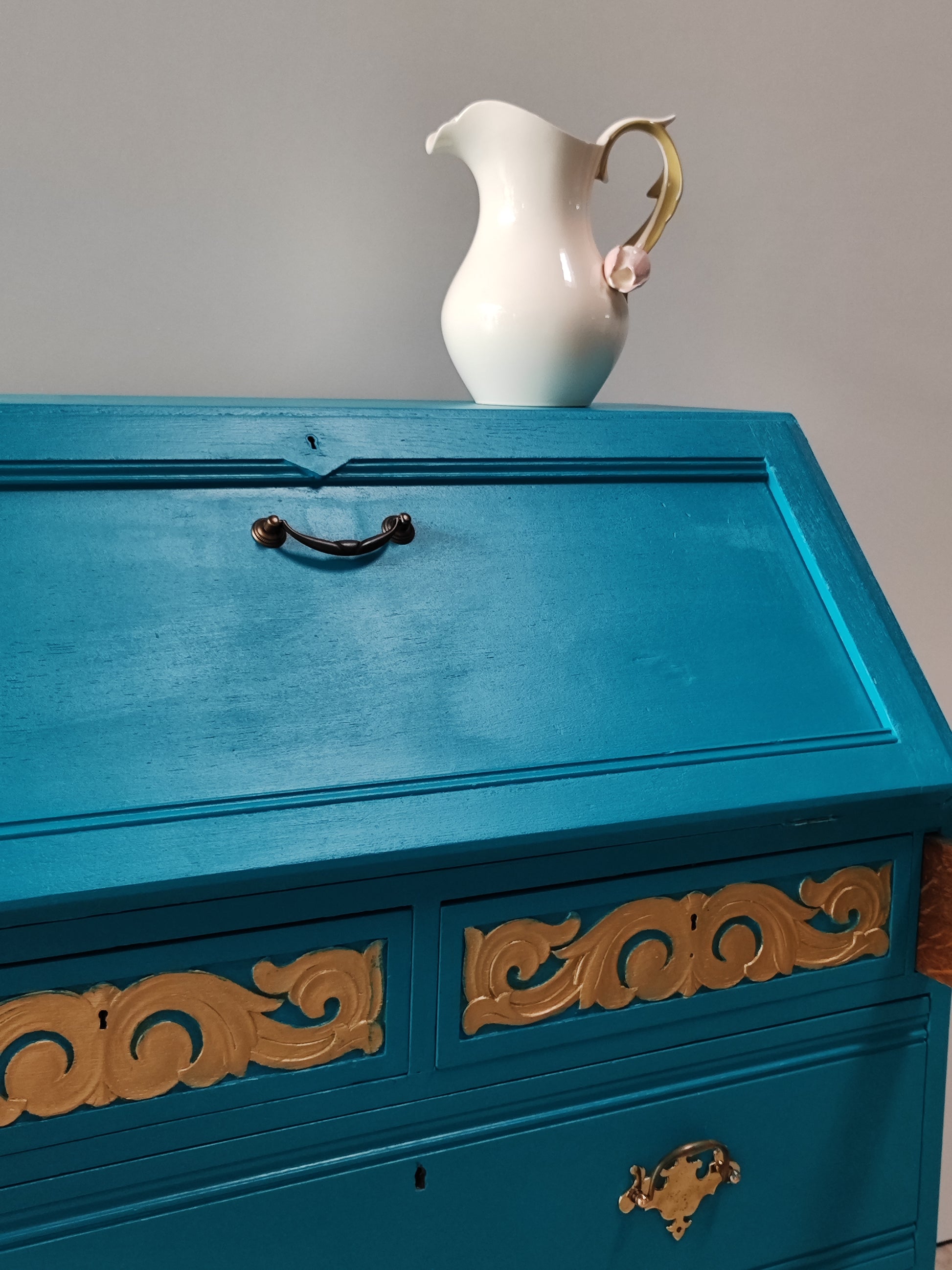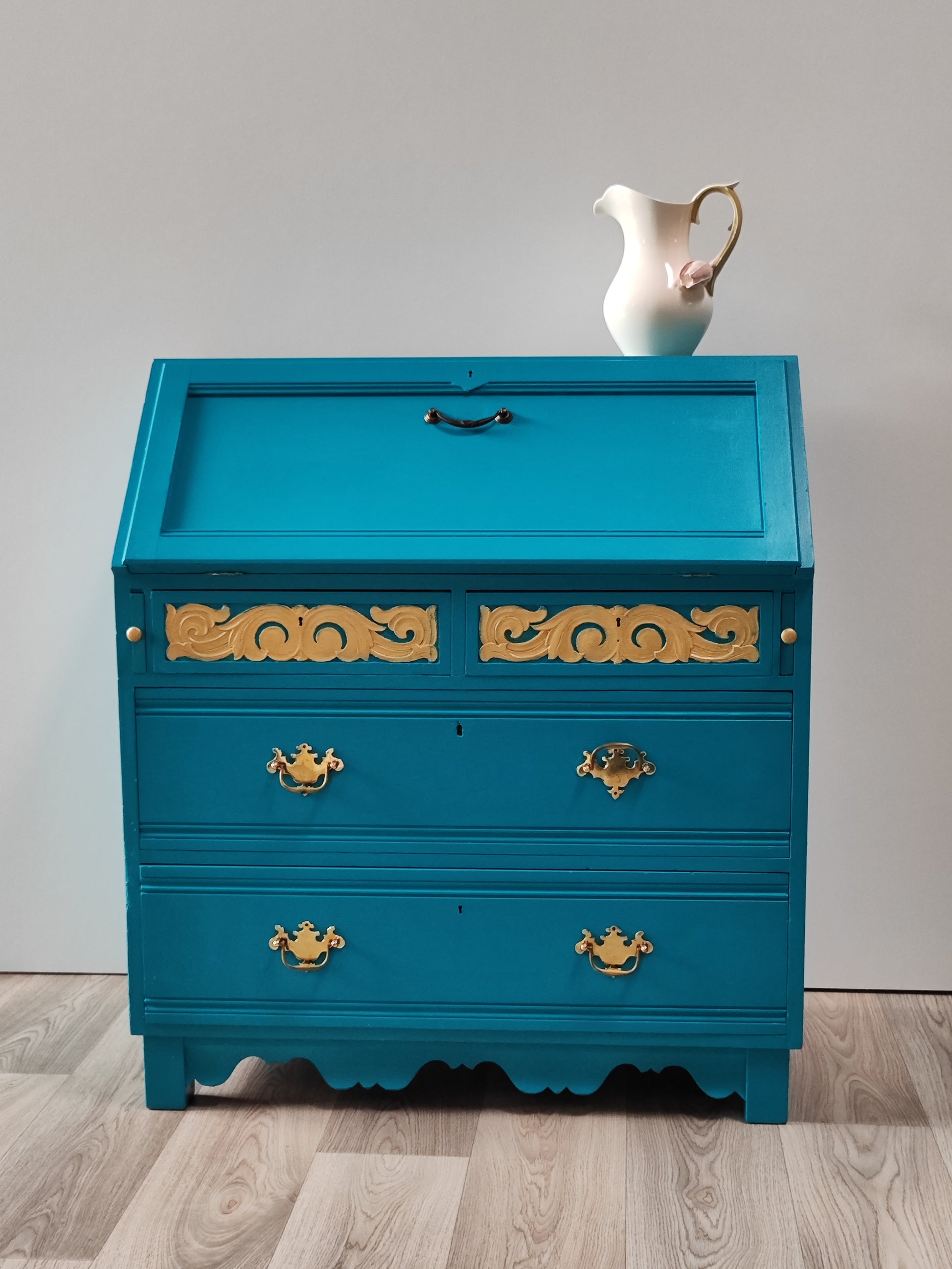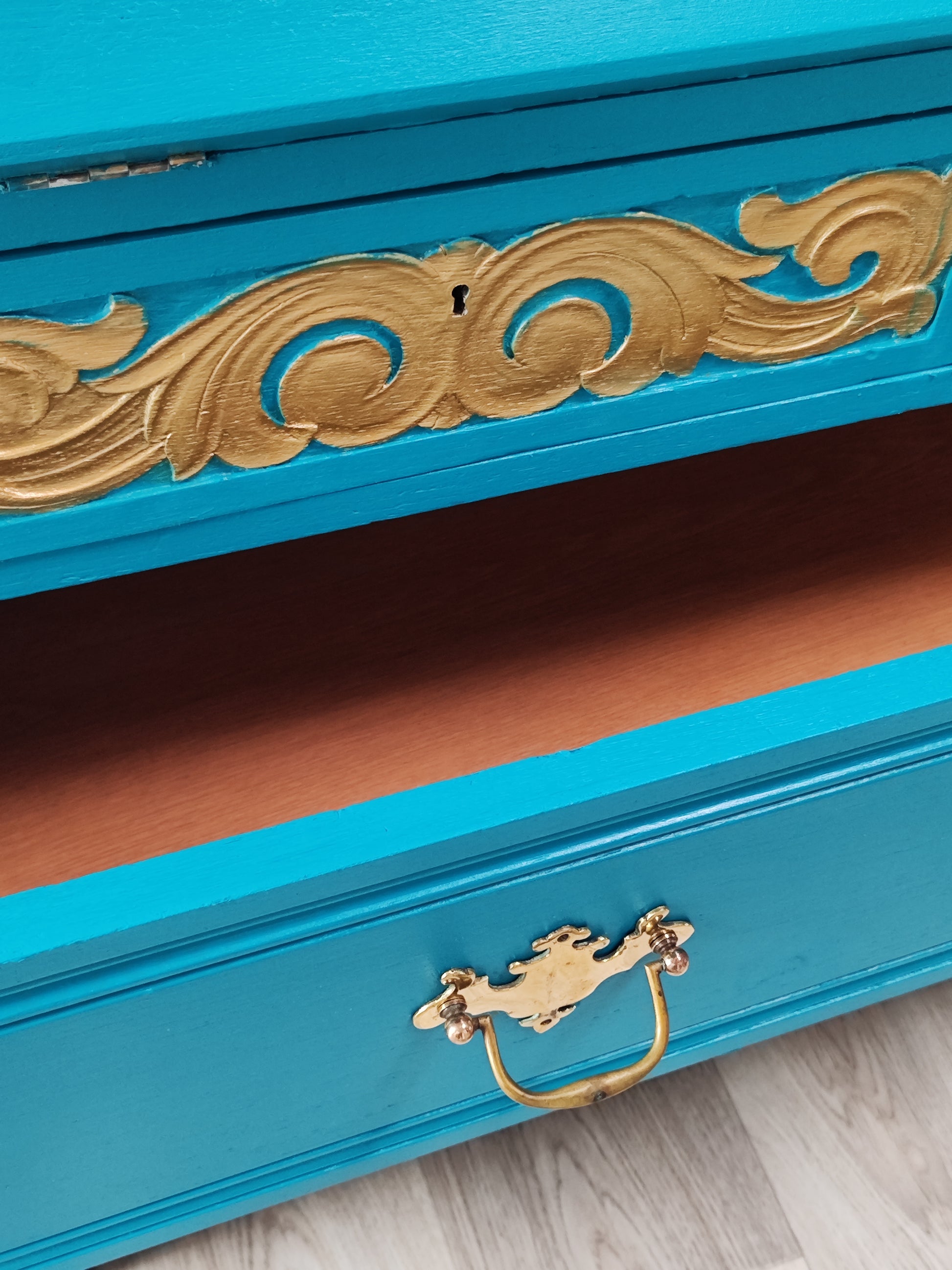 Der Sekretär-Kommode ist eine wahre Verkörperung von Schönheit und Praktikabilität. Die hochwertige seidig-matte Beschichtung auf Wasserbasis schafft eine einzigartige Textur, während seine Hitzebeständigkeit und Beständigkeit gegen Stöße und Kratzer eine lange Lebensdauer gewährleisten. Unabhängig von den atmosphärischen Bedingungen wird diese Kommode immer schön und stilvoll bleiben. Sorgfältig restauriert und mit hochwertiger hitzebeständiger Farbe überzogen, eignet er sich sowohl für klassische als auch moderne Interieurs hervorragend. Die bronzene Beschläge verleihen diesem Kunstwerk zusätzlichen Charme