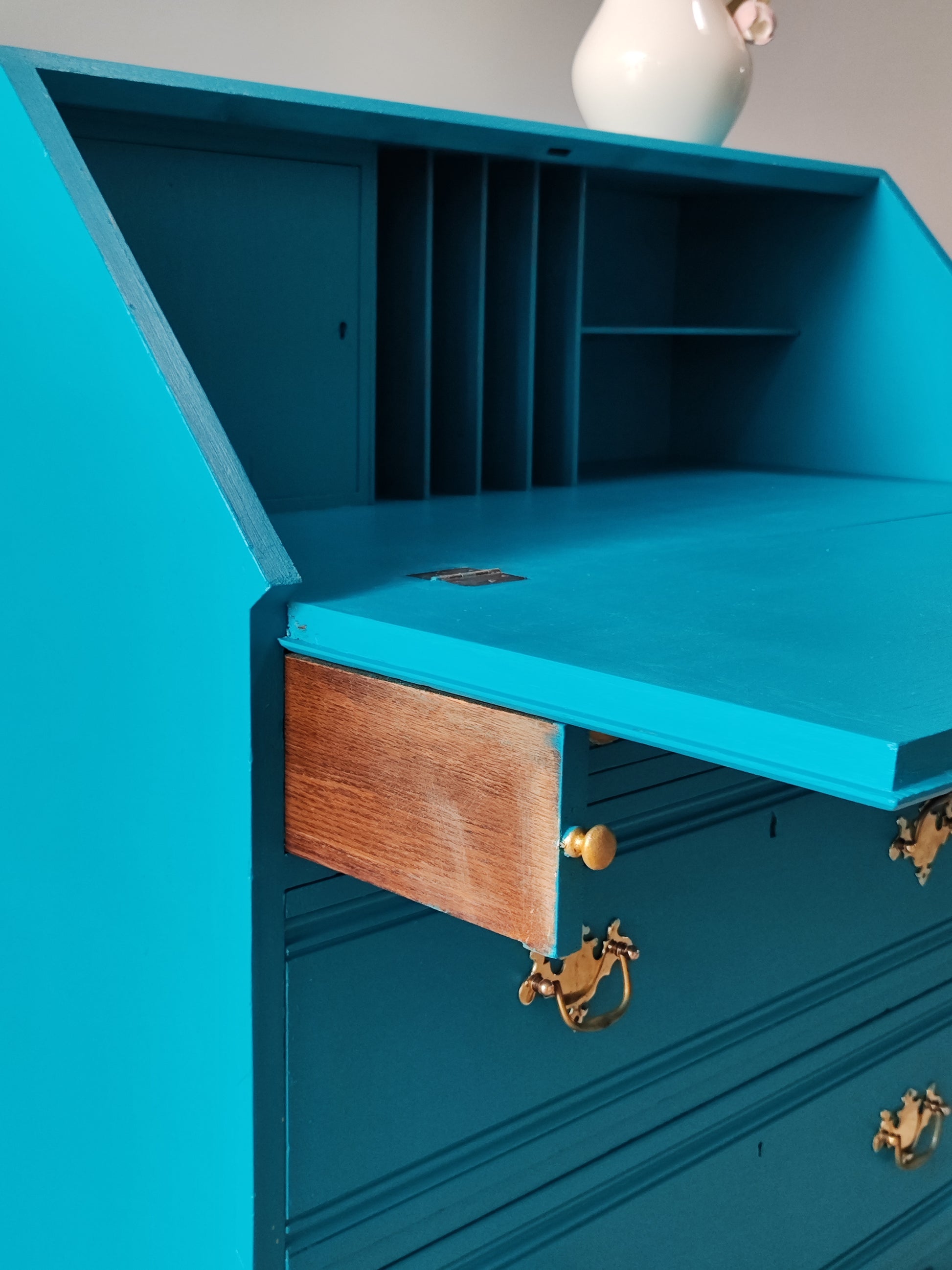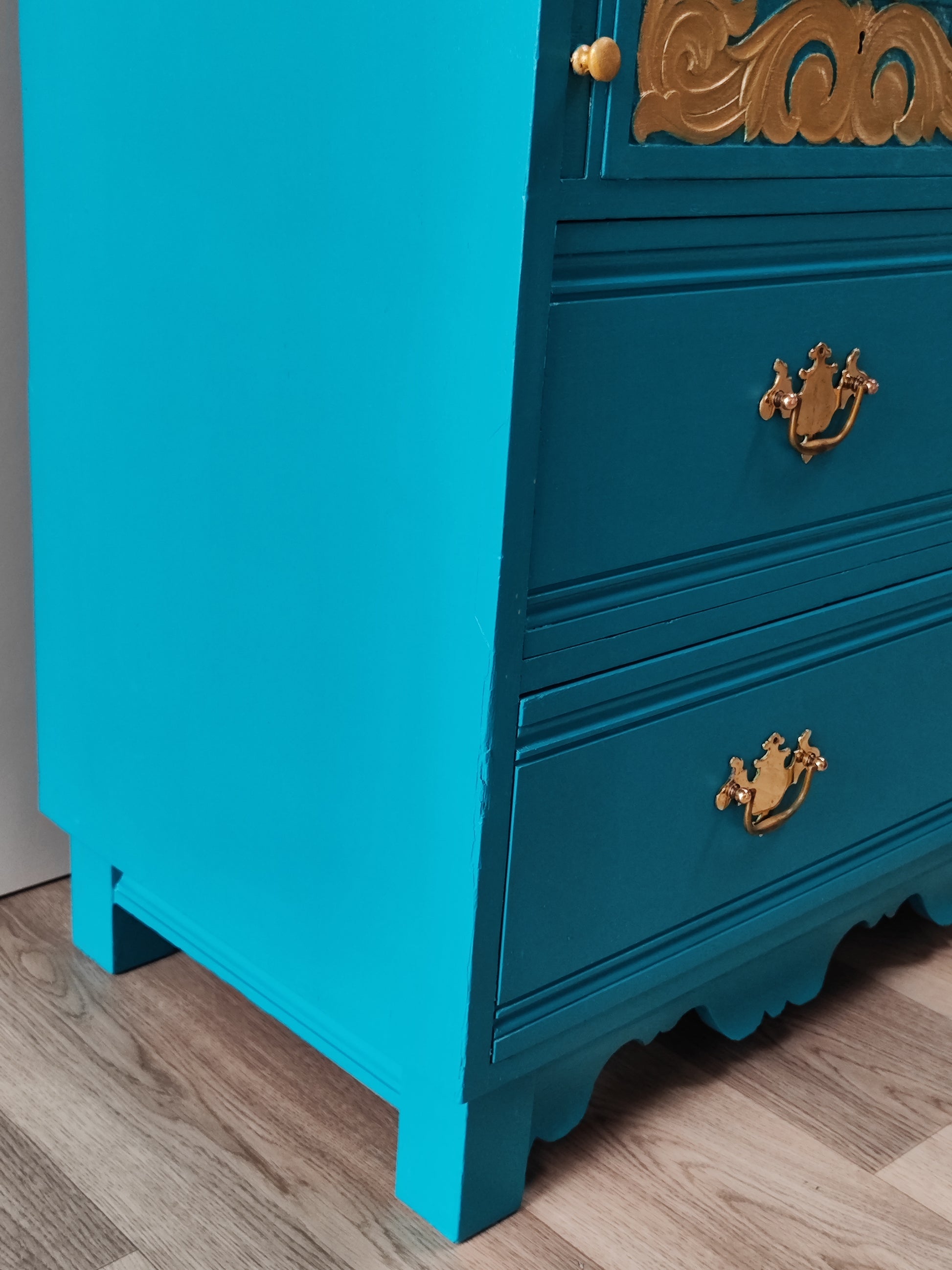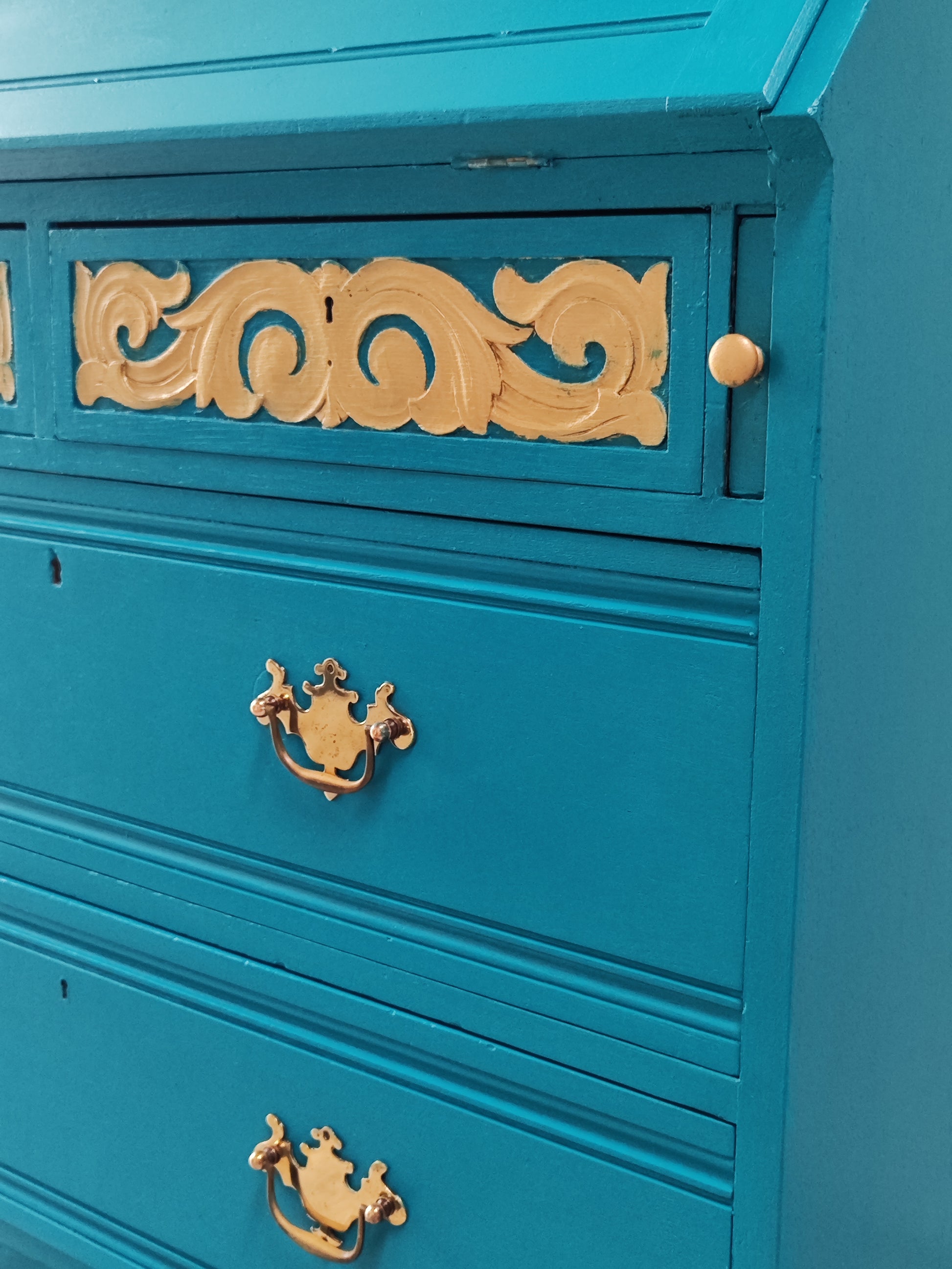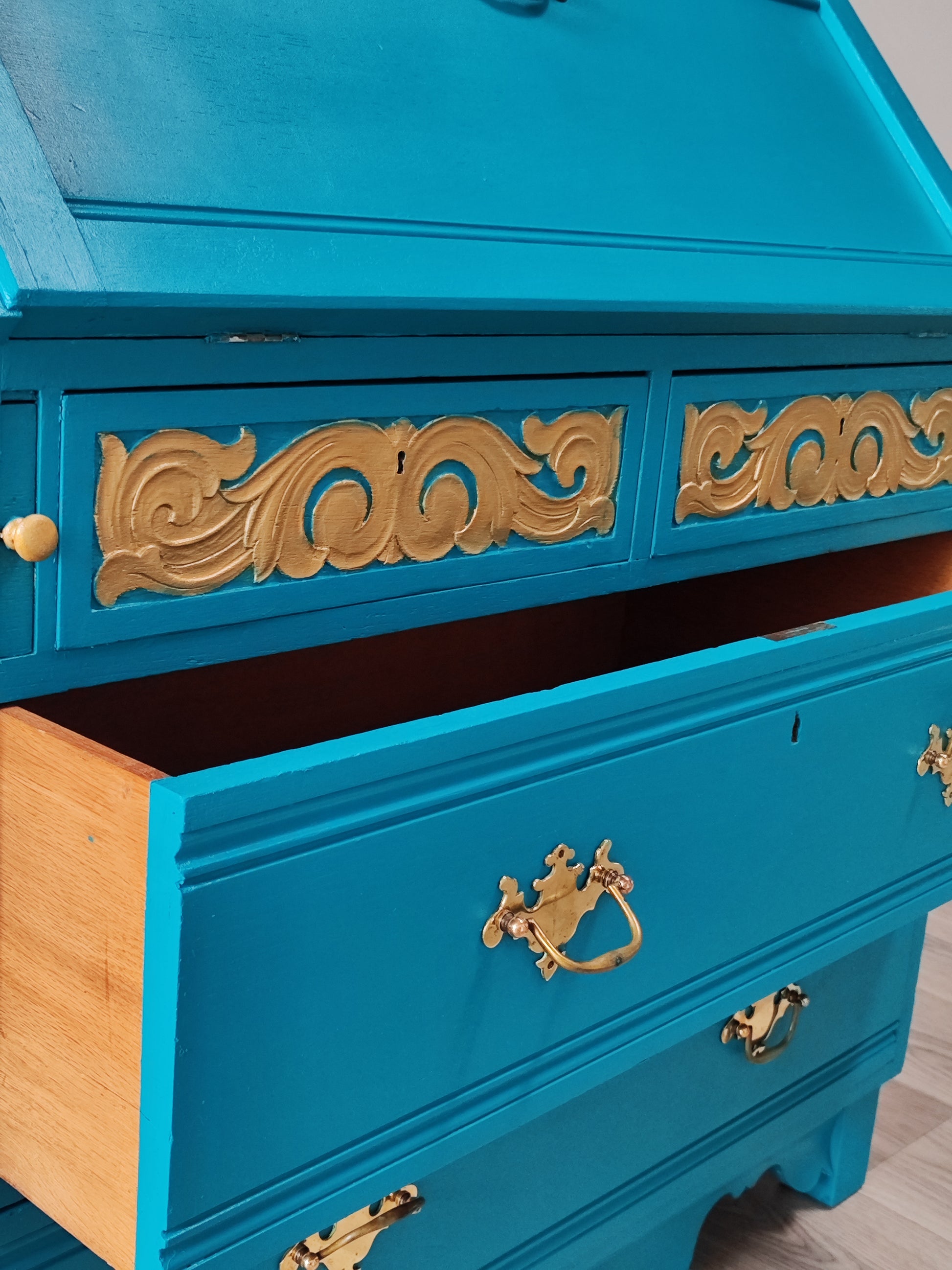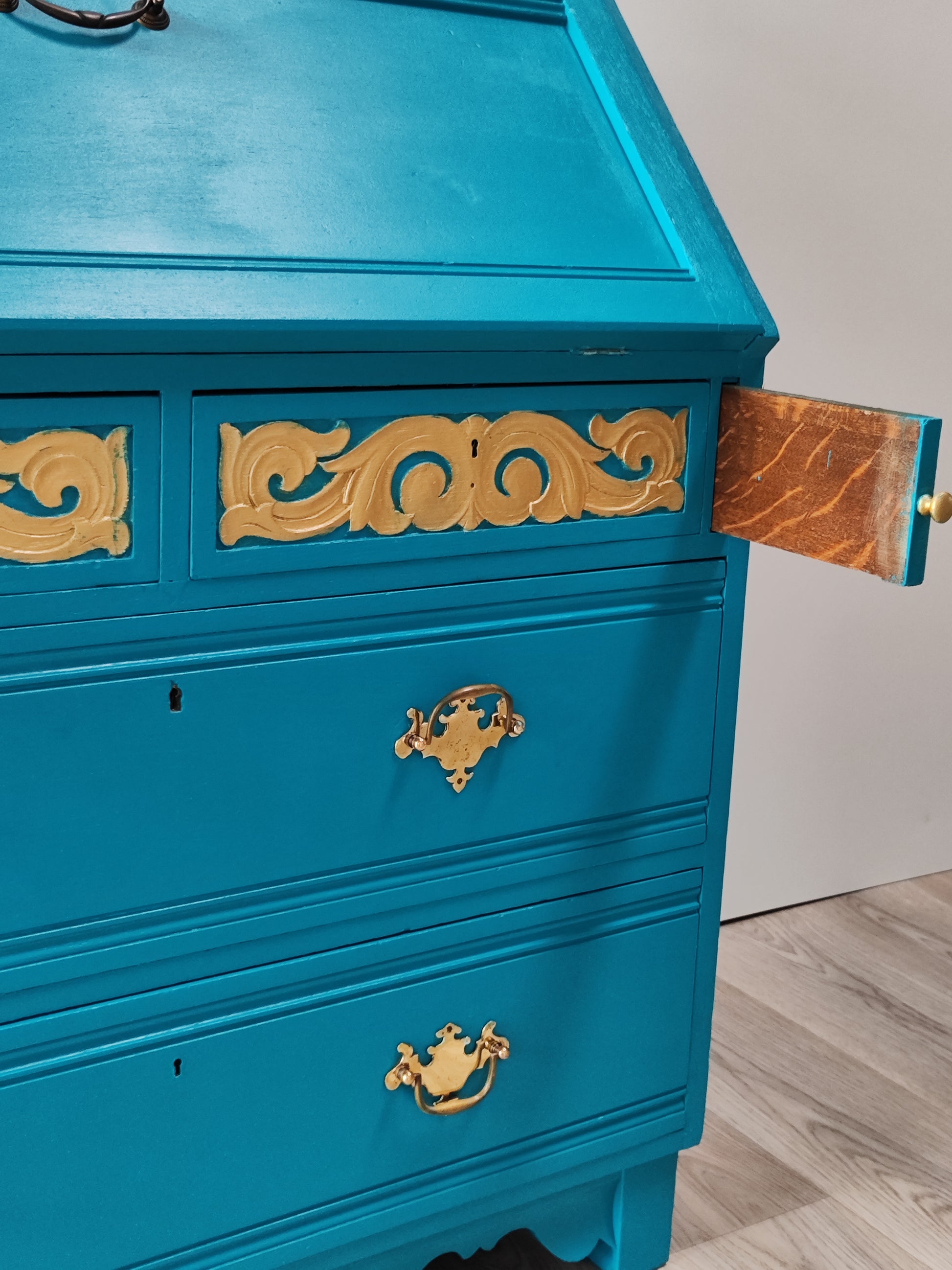 Der Sekretär-Kommode ist eine wahre Verkörperung von Schönheit und Praktikabilität. Die hochwertige seidig-matte Beschichtung auf Wasserbasis schafft eine einzigartige Textur, während seine Hitzebeständigkeit und Beständigkeit gegen Stöße und Kratzer eine lange Lebensdauer gewährleisten. Unabhängig von den atmosphärischen Bedingungen wird diese Kommode immer schön und stilvoll bleiben. Sorgfältig restauriert und mit hochwertiger hitzebeständiger Farbe überzogen, eignet er sich sowohl für klassische als auch moderne Interieurs hervorragend. Die bronzene Beschläge verleihen diesem Kunstwerk zusätzlichen Charme
